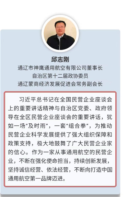 通遼市神鷹通用航空有限公司董事長、自治區(qū)政協(xié)第十二屆委員會委員邱志剛,作為自治區(qū)企業(yè)家代表應(yīng)邀參加了此次座談會。會后,按照自治區(qū)統(tǒng)戰(zhàn)部的統(tǒng)一部署,提交了參加座談會的收獲與感受,表示:一定要認真貫徹布小林主席講話精神,不斷在強化使命擔(dān)當(dāng),持續(xù)創(chuàng)新發(fā)展,堅持誠信經(jīng)營、依法經(jīng)營上下功夫,不斷向中國通用航空第一品牌邁進。